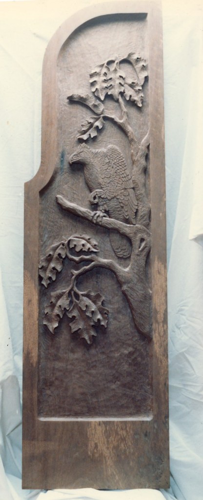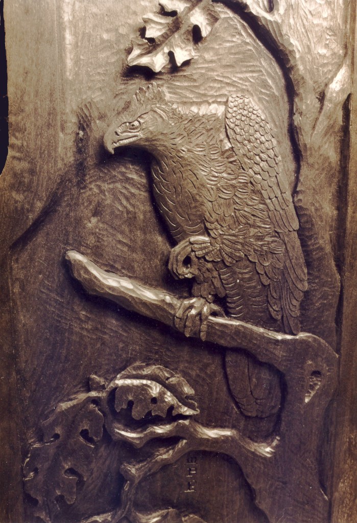 Hawk and Oak, Walnut and oak wood, 5 feet high