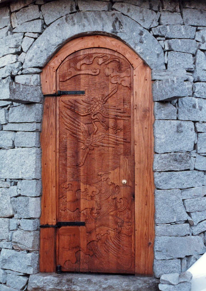 Well House Door, cranes and waves, red oak wood, 7 feet high
